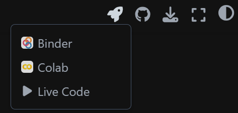 After each module, you can test your knowledge with a coding exercice in a jupyter notebook file. You can run the notebooks in three different ways, depending on your preference and setup. Select the rocket sign on the top right side of the page to see your three options:
